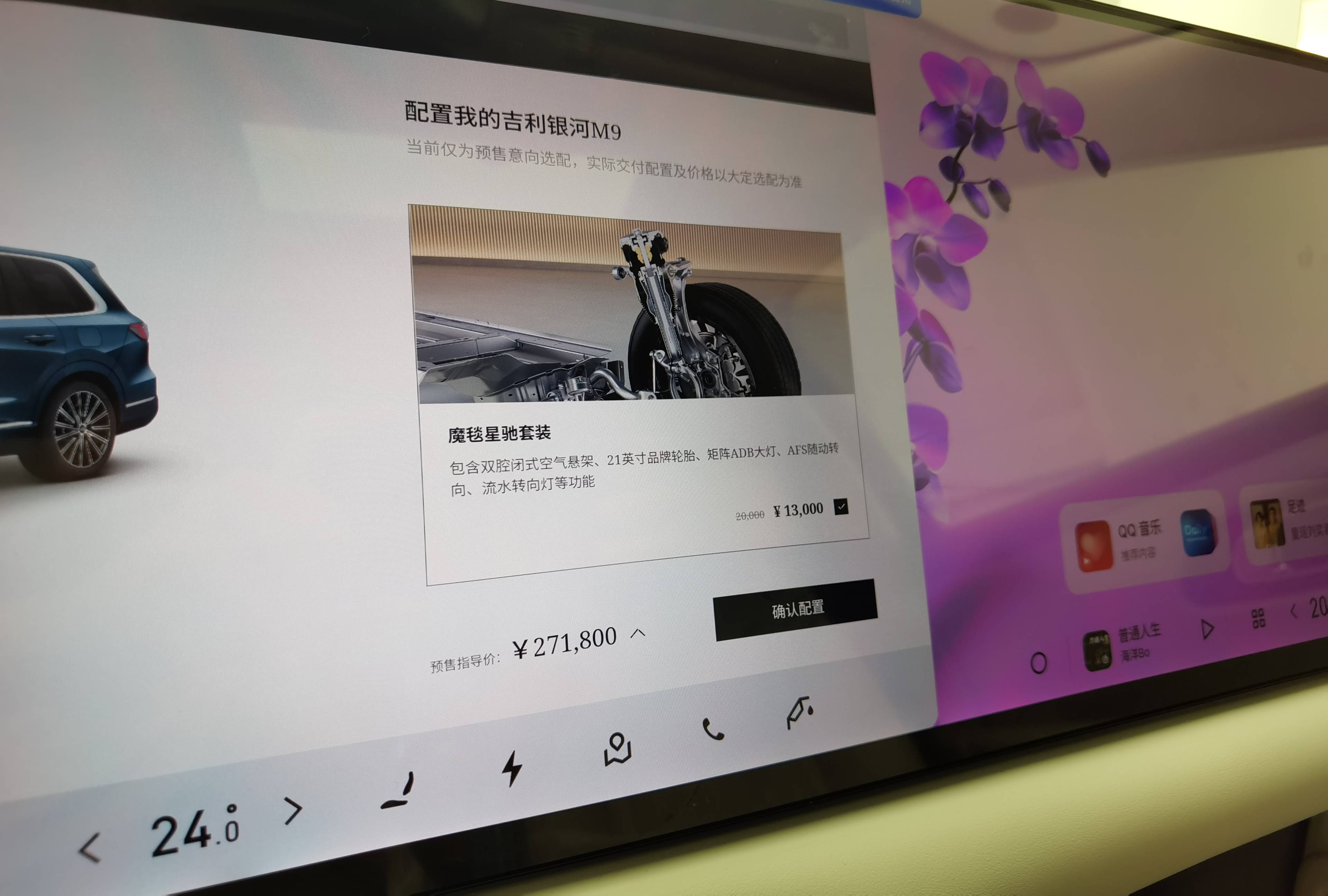 银河M9 预售价格出来后,讨论非常热烈。19.38 万起的预售价,很香!但一看配置表大伙就忍不住了:这车除了顶配,其他版本可以推沟里了!海报上看到的配置,如21英寸轮毂、矩阵大灯、双腔空悬、冰箱彩电大沙发等等,都堆到顶配或次顶配车型上,还要选配才有,一看价格都到 27 万去了!难怪有网友说,要不看看隔壁的蓝山,或者钛 7 吧!