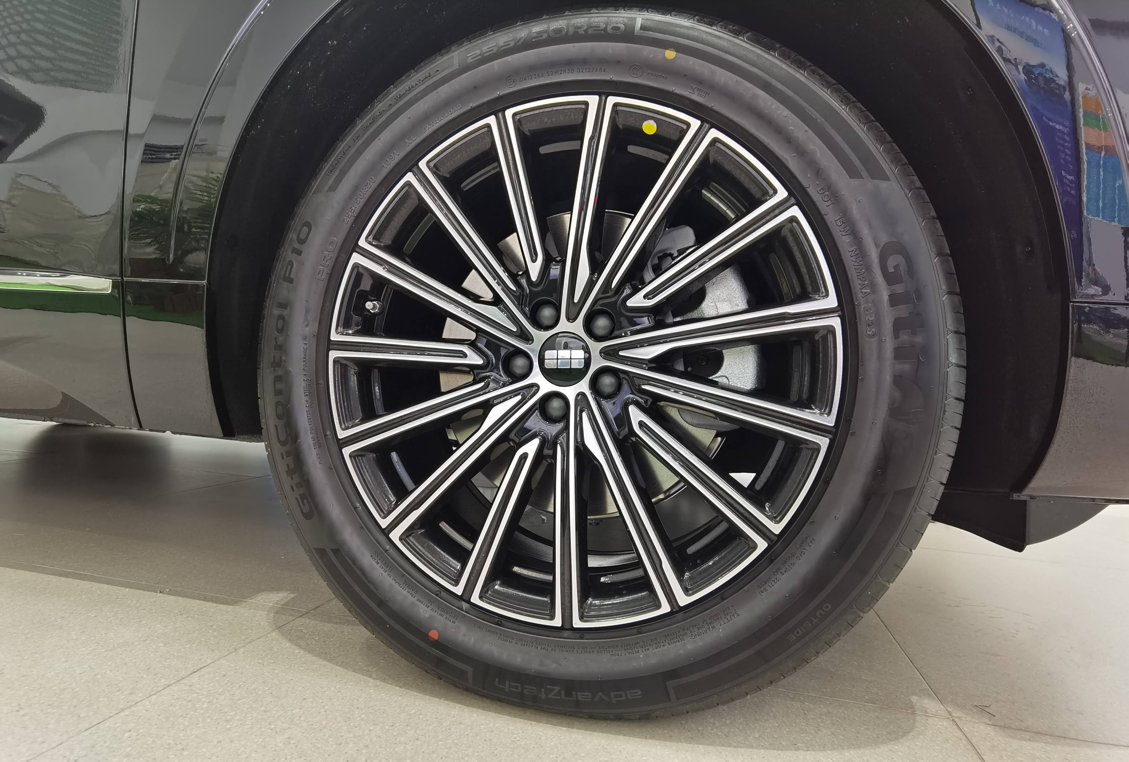 店里这台顶配车型,没有选装空悬,所以轮毂还是 20 英寸的,轮胎用的是佳通。特意趴地下看了一下后悬架,有铝合金组件,不知道是不是顶配特有,因为只有顶配才能选装双腔空悬。